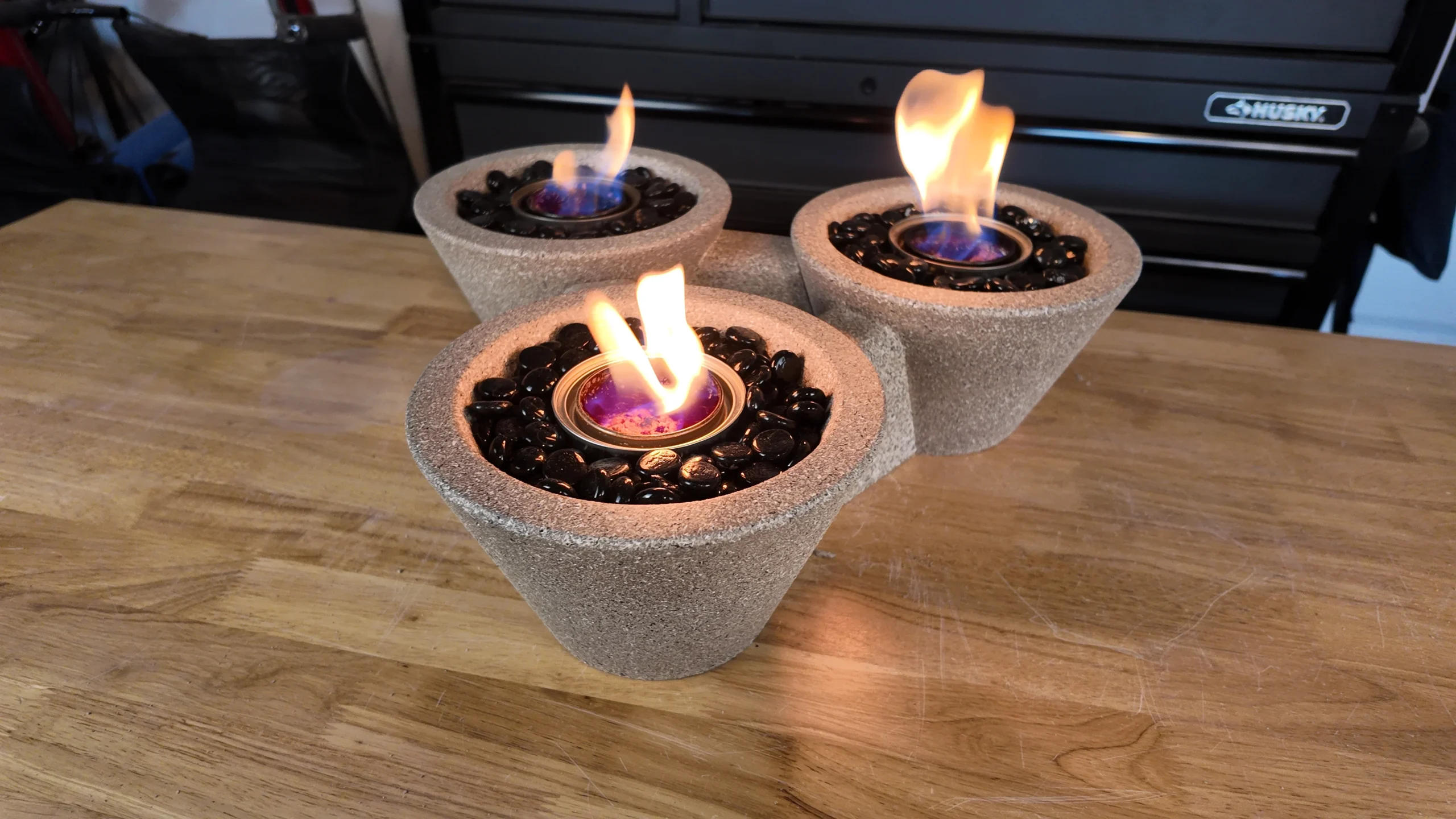 This tabletop fire feature can be created in multiple configurations. 3 units make a triangle, 4 units make a square. Make the modified middle bowl and make a straight line.